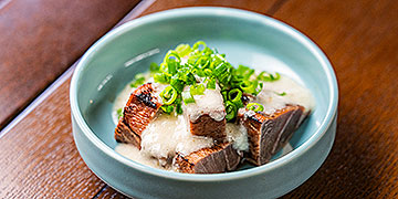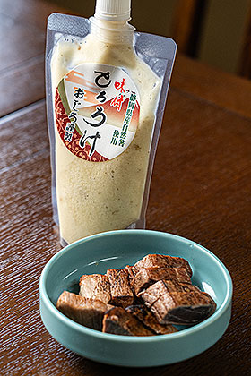 このお手軽に美味しいとろろを「焙り本マグロ」の上にたっぷりかけて「山かけ」にします。香ばしく焙った本マグロの美味しさと、鯖出汁の効いたとろろとの相性抜群で、いくらでも食べられちゃいます。