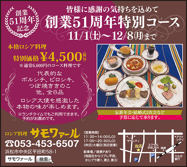当地に昭和49年「サモワァール」を開店。「一期一会」を大切に本物のロシア料理をと追求致しております。