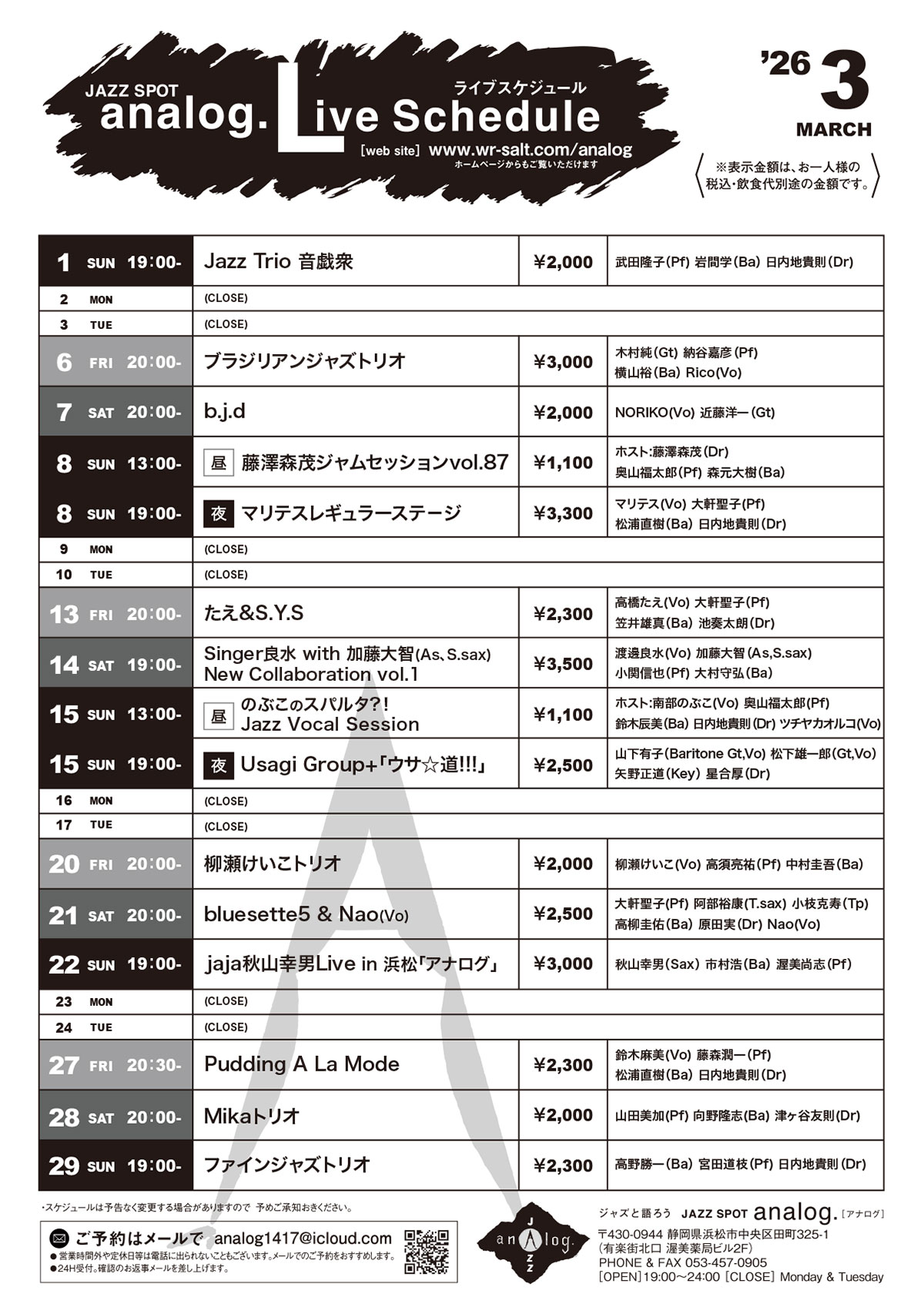 毎週、一流ジャズメンによるライブ、やります。JAZZ SPOT analog.[アナログ]浜松市