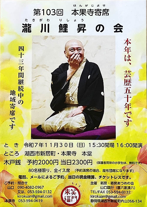 【第103回 本果寺寄席「瀧川鯉昇の会」】