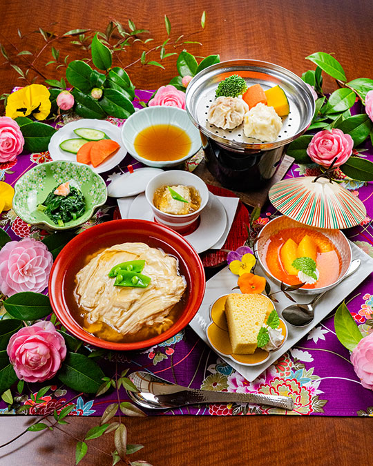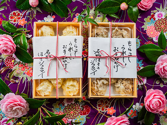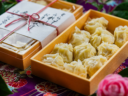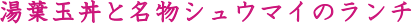 名物シュウマイは えびのシュウマイ、お肉のシュウマイからお選びいただけます (例:えび2個 or お肉2個 or えび1個お肉1個) 湯葉玉丼、湯葉の刺身、 名物シュウマイ(2個)、海老真薯、デザート