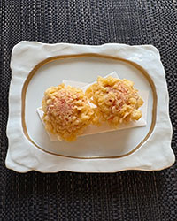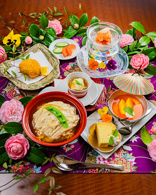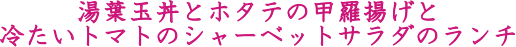 人気のホタテの甲羅揚げと トマトシャーベットが楽しめるランチ 湯葉玉丼、湯葉の刺身 ホタテの甲羅揚げ、トマトのシャーベットサラダ、デザート