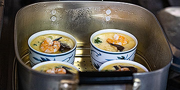 春の山菜を贅沢に使った茶碗蒸し。ワラビやタラの芽をはじめ、百合根や銀杏、京都産の菜の花、椎茸や海老など具沢山。茶碗蒸しを成功させるコツは卵と出汁の割合と火加減です。卵1に対して出汁2.5-3の割合で、強火で3分、弱火で10分程度蒸し器で火を通せば、誰でもふんわり出汁の香る茶碗蒸しができちゃいます。是非お試しあれ!