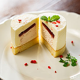 優しい味わいのミルクムースの中に「いちごジュレ」と「いちごレアチーズ」。アーモンド風味のしっとりとした生地と一緒に食べれば、懐かしいあの飴の味...(?)が口の中に広がります。