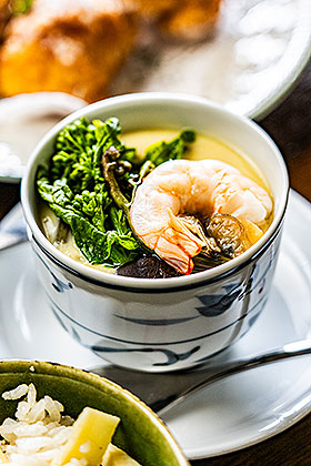 贅沢な真鯛の味を引き立てる為に、スープには昆布、真鯛、蛤、あさり、たっぷりの野菜を使いました。ワラビ、こごみ、たらの芽も春の気分を盛り上げます。 |