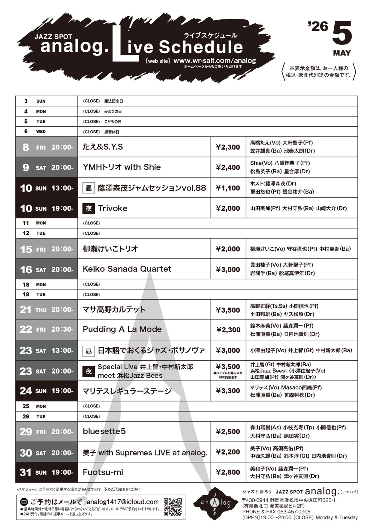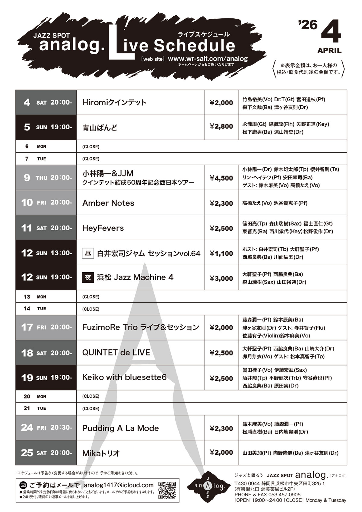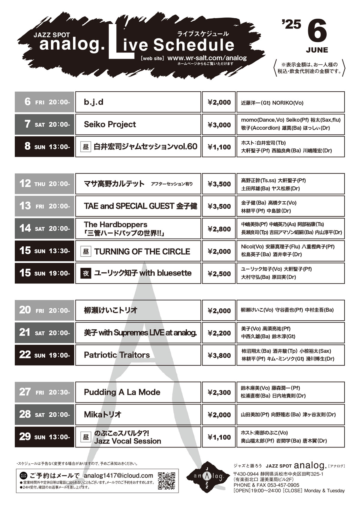 毎週、一流ジャズメンによるライブ、やります。JAZZ SPOT analog.[アナログ]浜松市