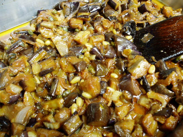 茄子のカポナータ。ちまたでは、イタリア版のラタトゥーユ(フランス料理)などと紹介されますが、本当は違うんですよ。シチリアは茄子、セロリ、松の実やカッペリ(ケイパー)等々、、、。ココアパウダーが入ったりするリチェッタ(レシピ)もあるようです。Siciliaは食文化も本土とは違っております。作る人が間違えて安易にしないようにしたいものです。それが一番恐い事ですから、、、。注意注意*-*