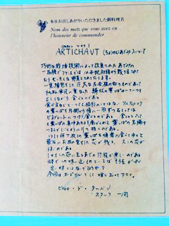 21歳の頃、遠州文化連盟という音楽の鑑賞団体と出会い、スタッフとして加わるようになりました。学生時代、フリーター時代、そして一年遅れの就職先は地方公務員だったのですが、当時の事務局は継続を認めてくれました。結局、1999年7月の解散時までスタッフの一人として手伝っておりました。1977年頃、社会人向けのテーブルマナー教室とフランスワインを味わう「フランス料理の夕べ」という企画が持ち上がりました。現在のターバンさんで月一回、会費3300円、定員10名、ワイン三種でコース料理という設定でした。当時の私の地方公務員としての月給は75000円でした。当時の浜松でも毎月は満席になるどころか、4~5人という月がありました。設定日の二日程前になると事務局から電話があり、員数合わせのホストを頼まれました。当然、正規料金です。当夜は、シェフの料理説明、ナイフとフォーク、スプーンの使い方、そしてワインの説明、魚や肉の調理方法など、毎月内容を巧みに変えられたので、フランス料理とフランスワインが判ったような気分になったと記憶しています。何度目かのメイン食材が、蒸した「アーティチョーク」でした。一枚一枚、ガクを外して食べました。私は、この料理を「暮しの手帖」で見て知っておりました。もちろん食したのは、この時が初めてでしたが。ターバンさんの当時の貴重な説明書き(画像③)を保管してありましたので参考に提供します。浜松市内では、ターバンさんの次に1983年開業のエピファニーさんに出会い、「ワインを楽しむ会」にも参加、現在までお付き合いさせていただいております。この「ソルト・ドット・コム」から声をかけていただいてからは、豊橋のフラスカテイさんと出会い、食体験をイタリアンまで広げることができるようになりました。