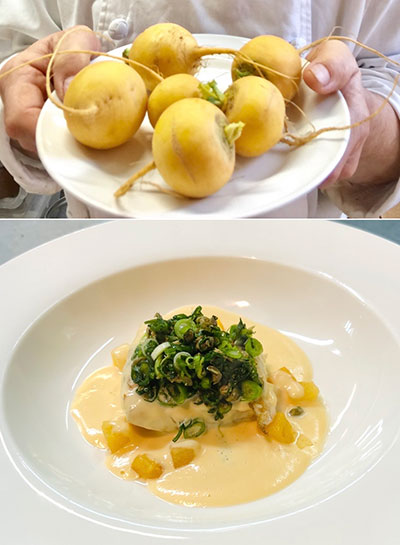 舞阪港の魚のポワレ 鈴木農園の黄カブのソース 葉ネギとケッパー添え